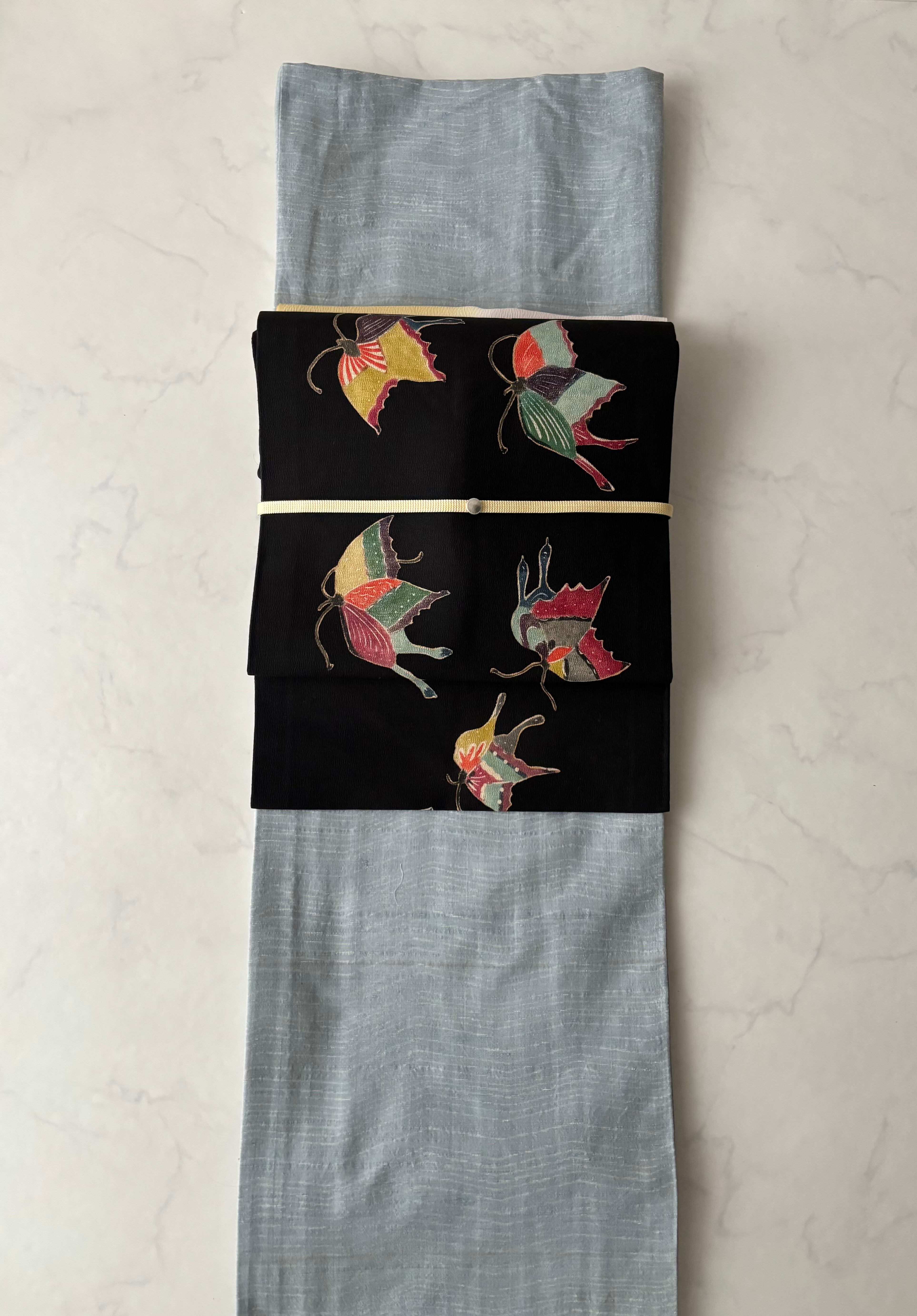なごや帯 黒地 蝶文 縮緬 なごや帯