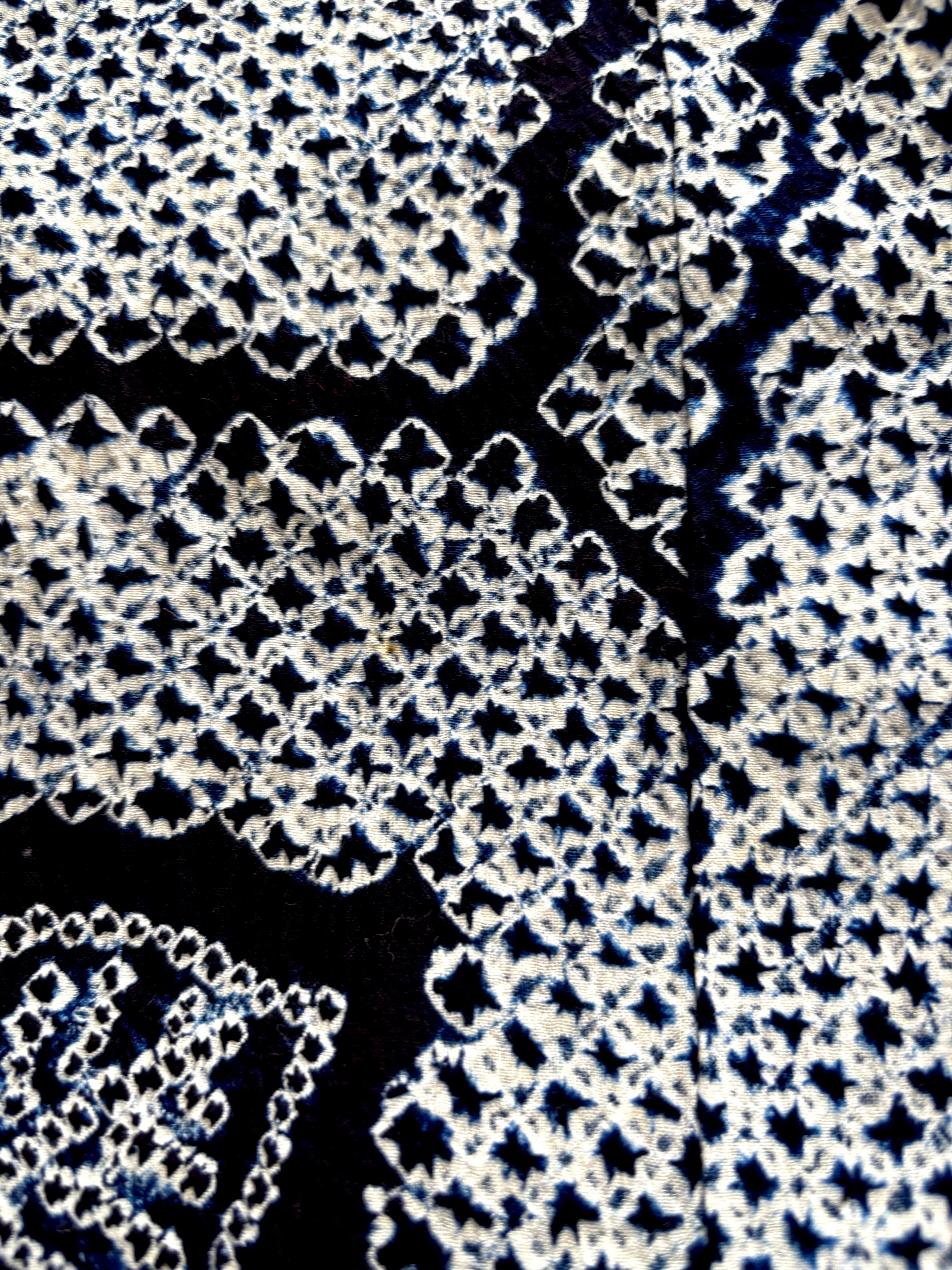 濃紺に白地の抽象花文の絞りの浴衣です。