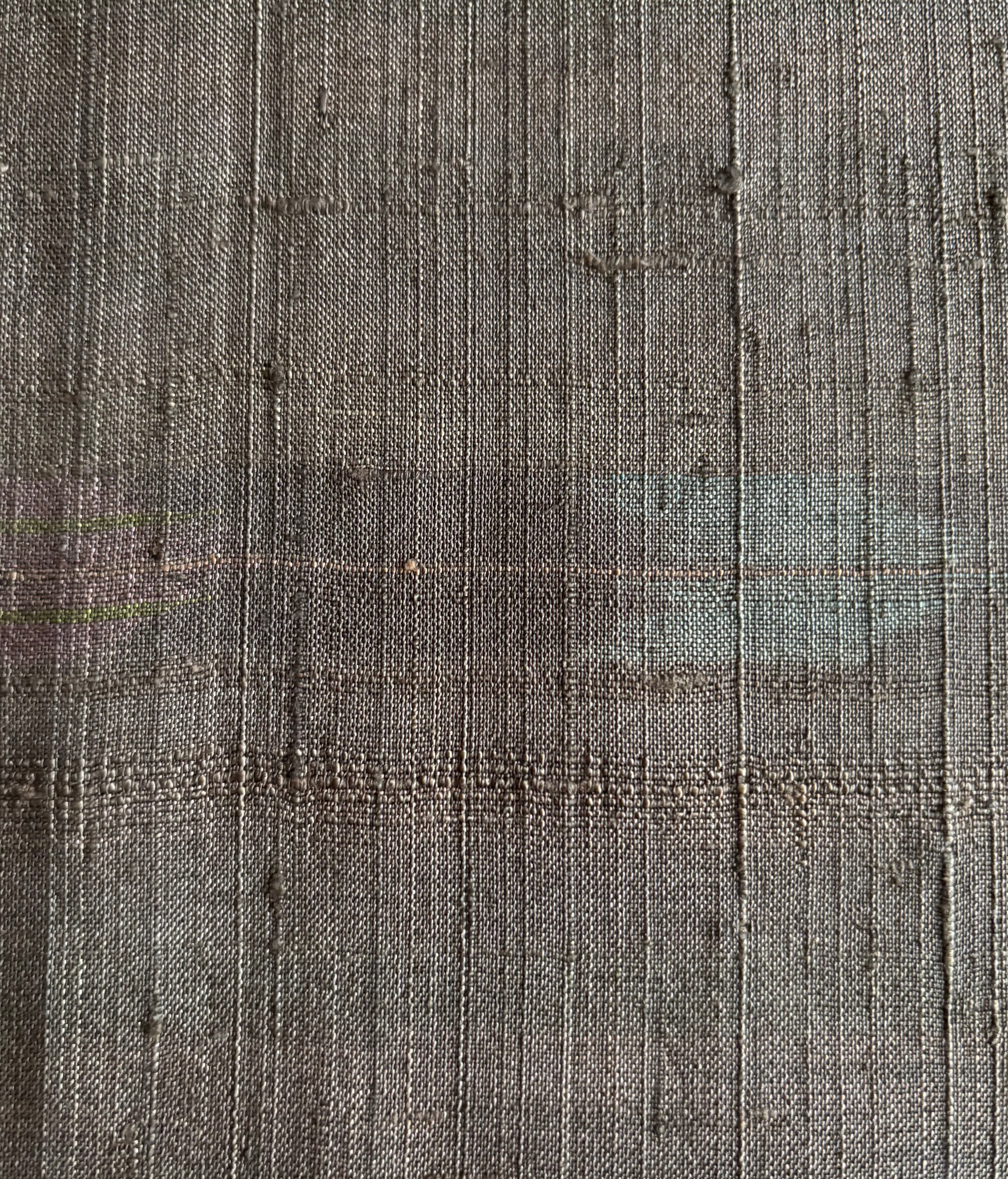 横段に矢羽模様が織り出され、落ち着いた地色にパステル調の淡いピンクやミントの矢羽が