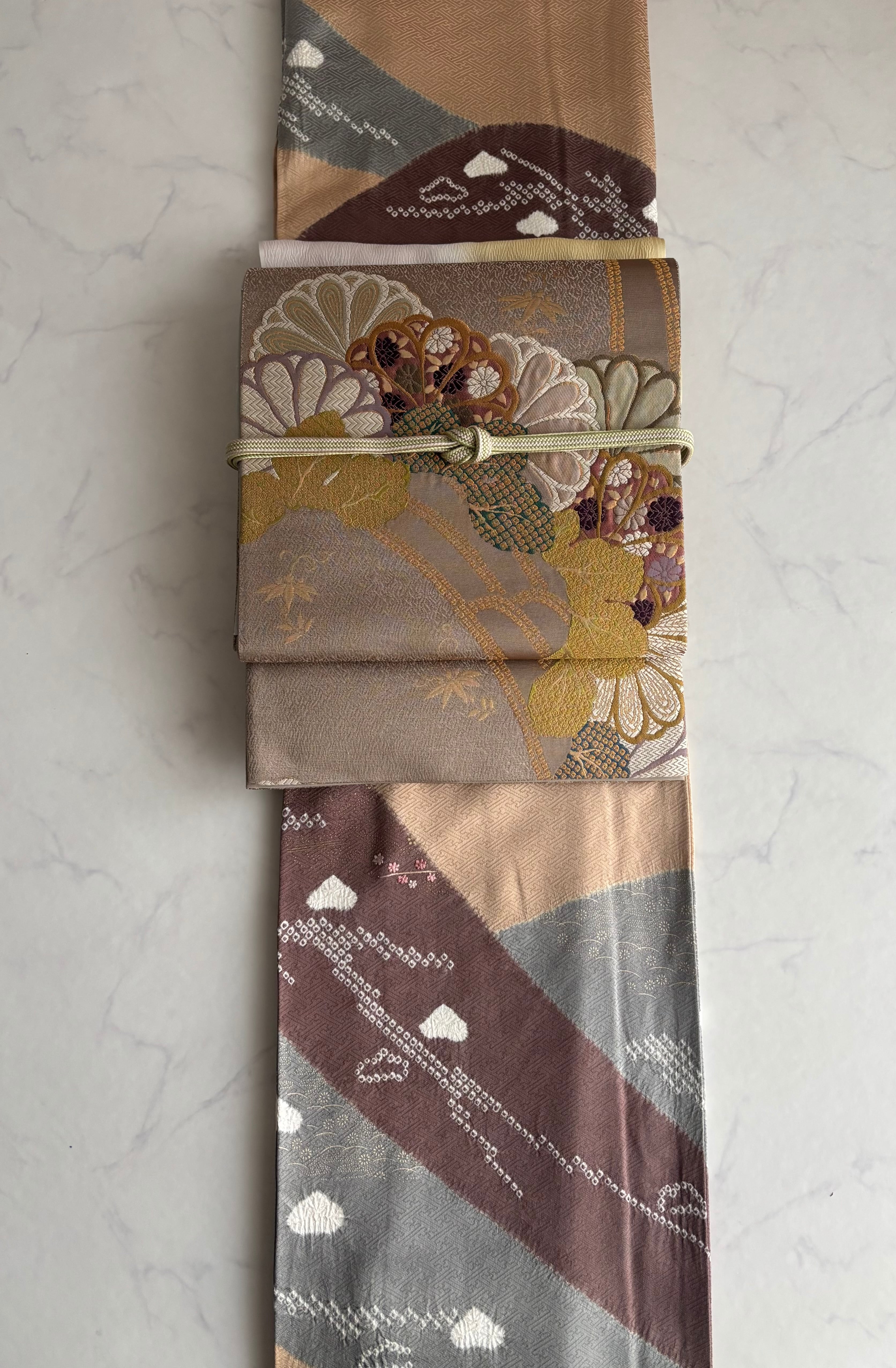 葉の周りには小さい刺繍の花文様や金彩の小花が散りばめられて、品のよい華やかさを醸し出しています。