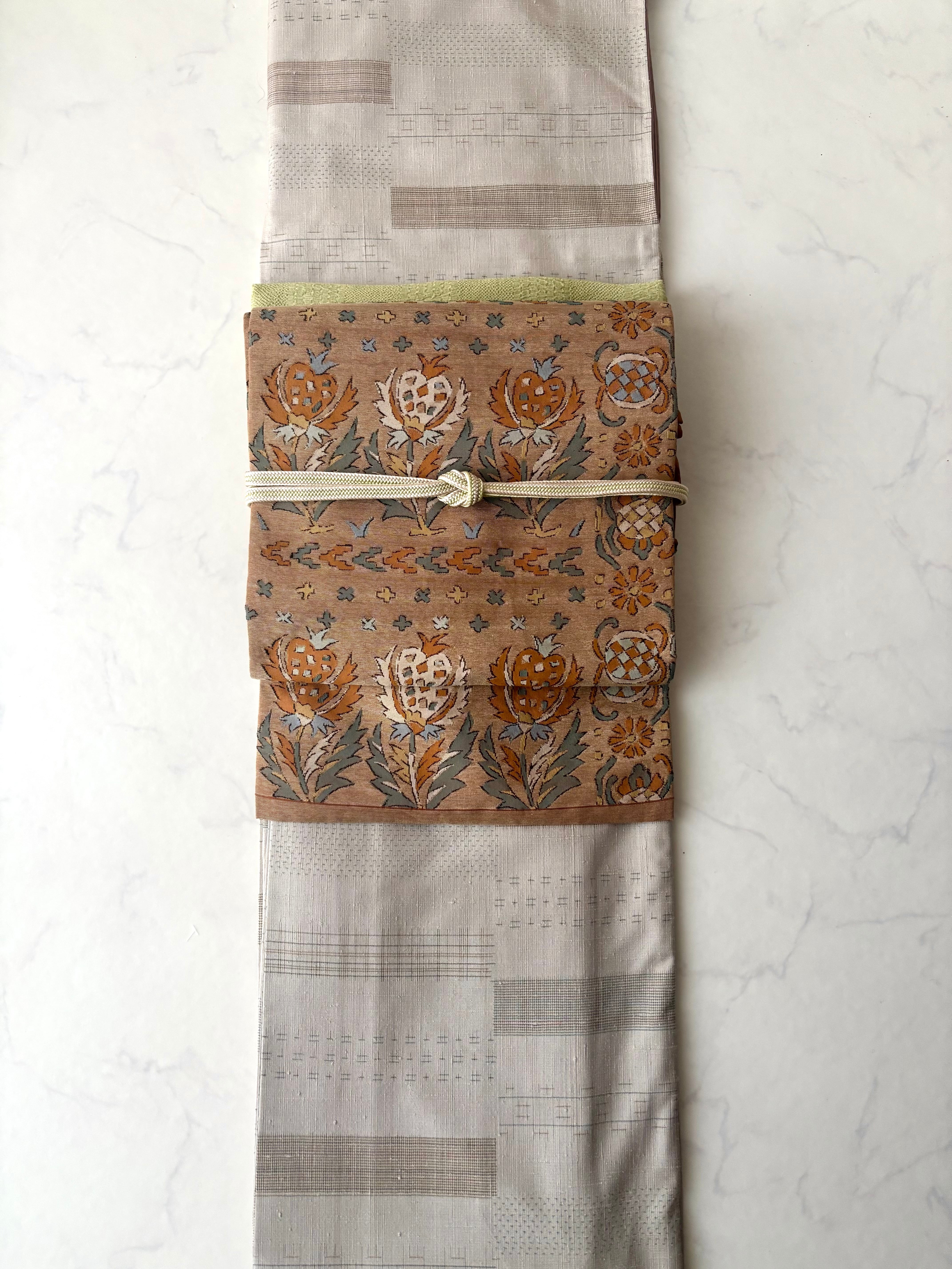 グレージュ地に変わり市松文の紬のお着物です。