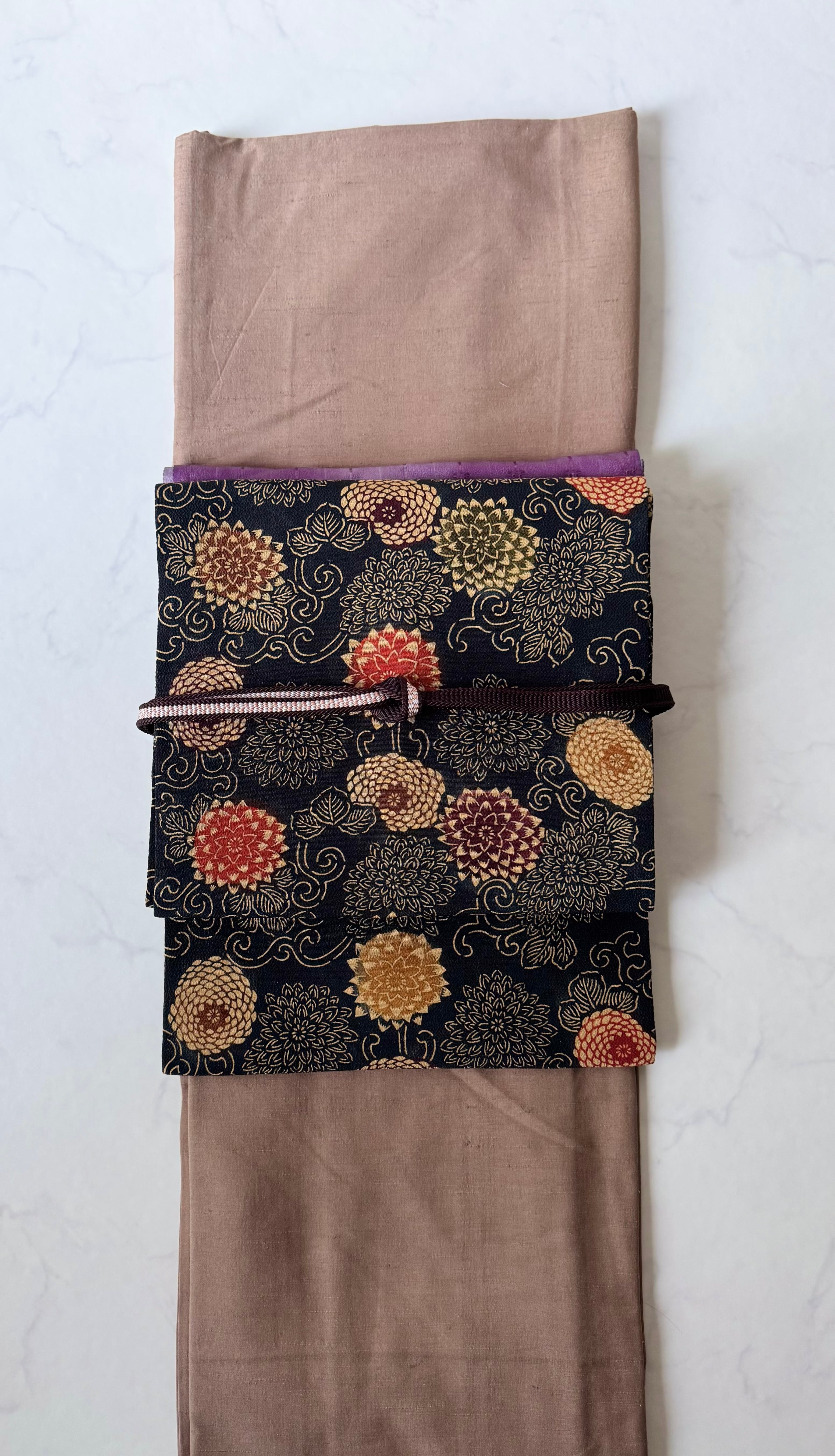 濃紺の地に花唐草模様が描かれたなごや帯です。