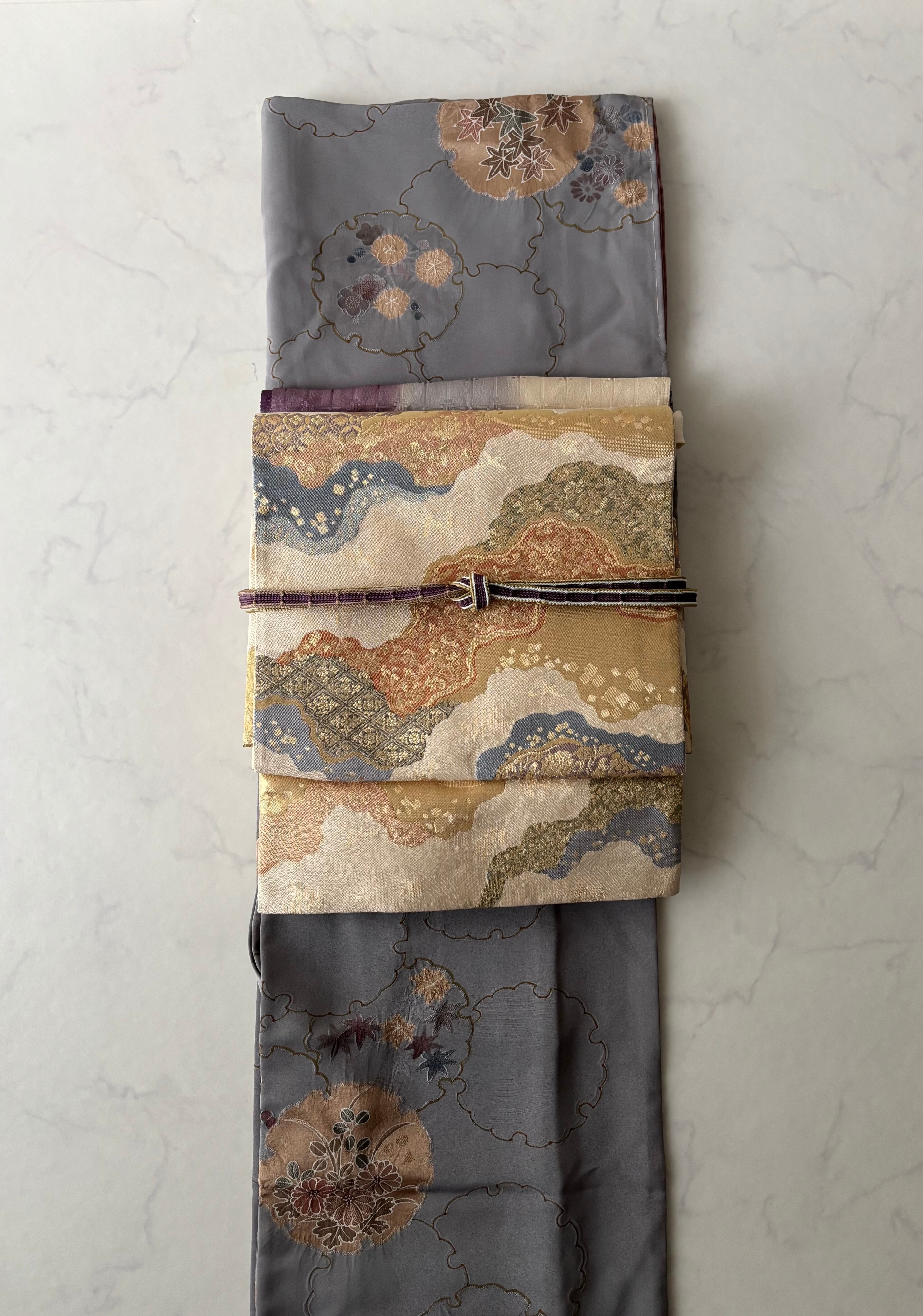 袷 ミドルグレー地 雪輪に四季花文 小紋